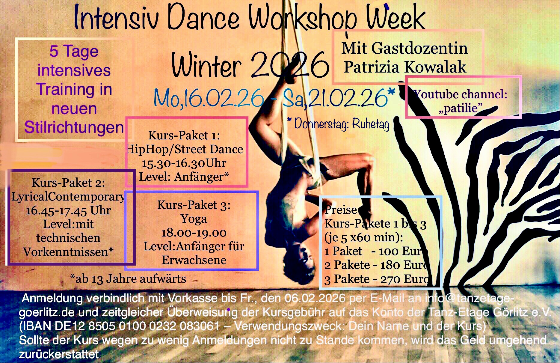 Nur mit Anmeldung und Vorkasse bis zum 06.02.2026 per E-Mail und Überweisung der Kursgebühr (5 x 60 min zu 100 Euro/Kurs) auf das Konto der Tanz-Etage.